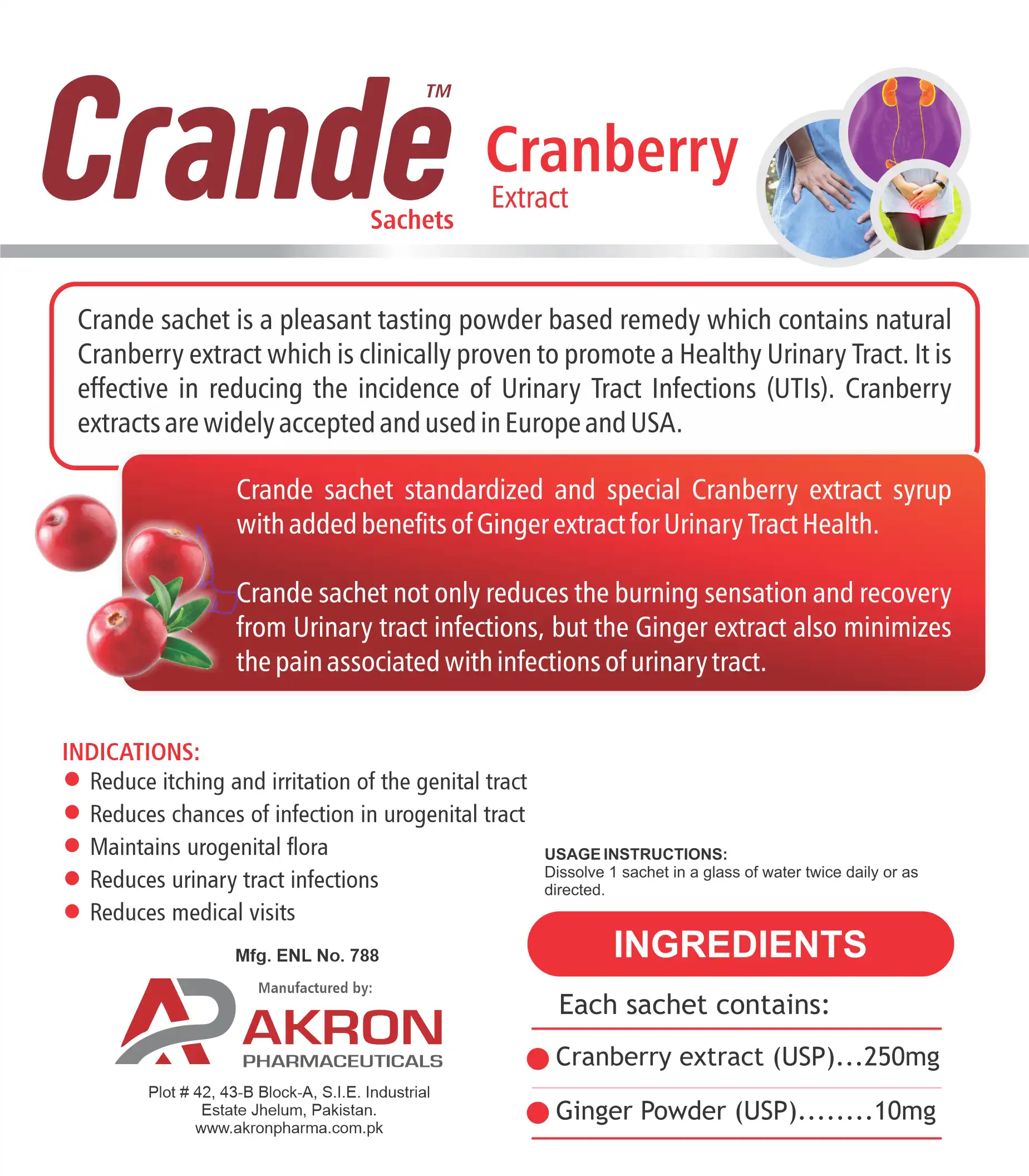 Crande Sachet is a convenient powder-based remedy formulated with natural Cranberry extract to promote urinary tract health. Cranberry contains bioactive compounds that help prevent bacteria from adhering to the urinary tract walls, thereby reducing the incidence of UTIs.
