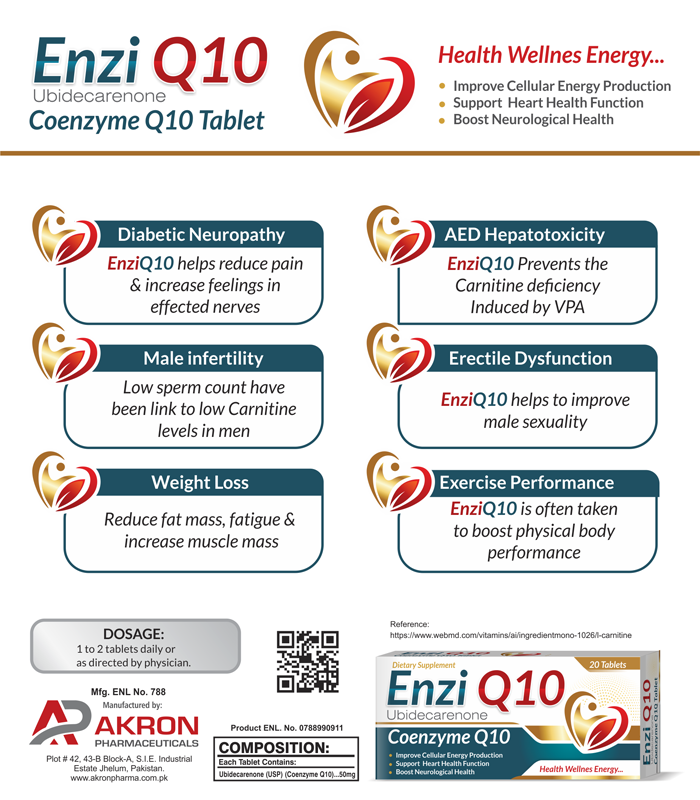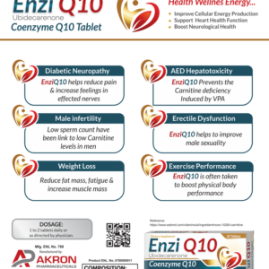 Enzi-Q Tablet is formulated with Ubidecarenone (Coenzyme Q10), an essential nutrient that plays a vital role in energy production at the cellular level. CoQ10 helps the body generate energy efficiently while protecting cells from oxidative stress.