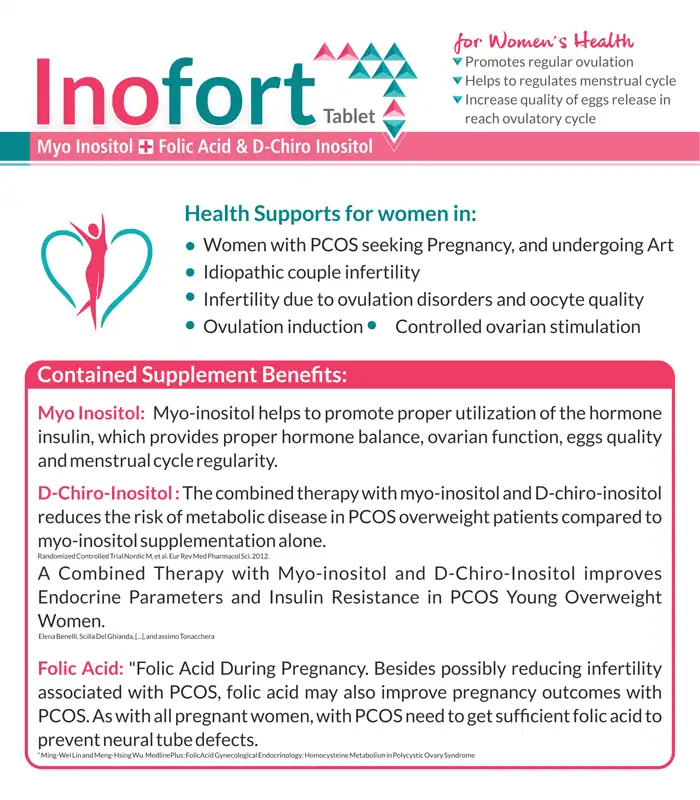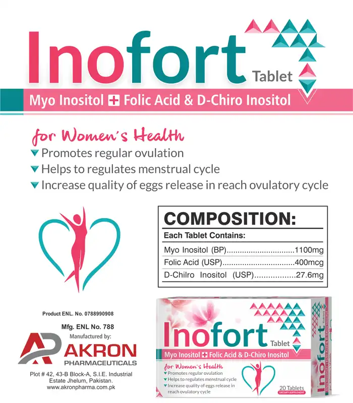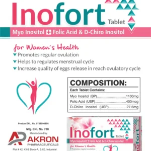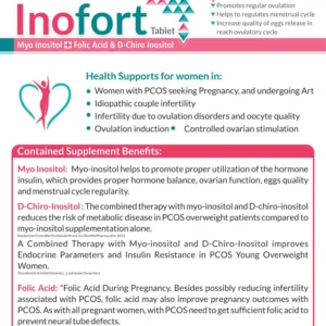 Inofort Tablet is an advanced women’s health supplement combining Myo Inositol, D-Chiro Inositol, and Folic Acid in an optimal ratio to support hormonal balance and reproductive wellness.