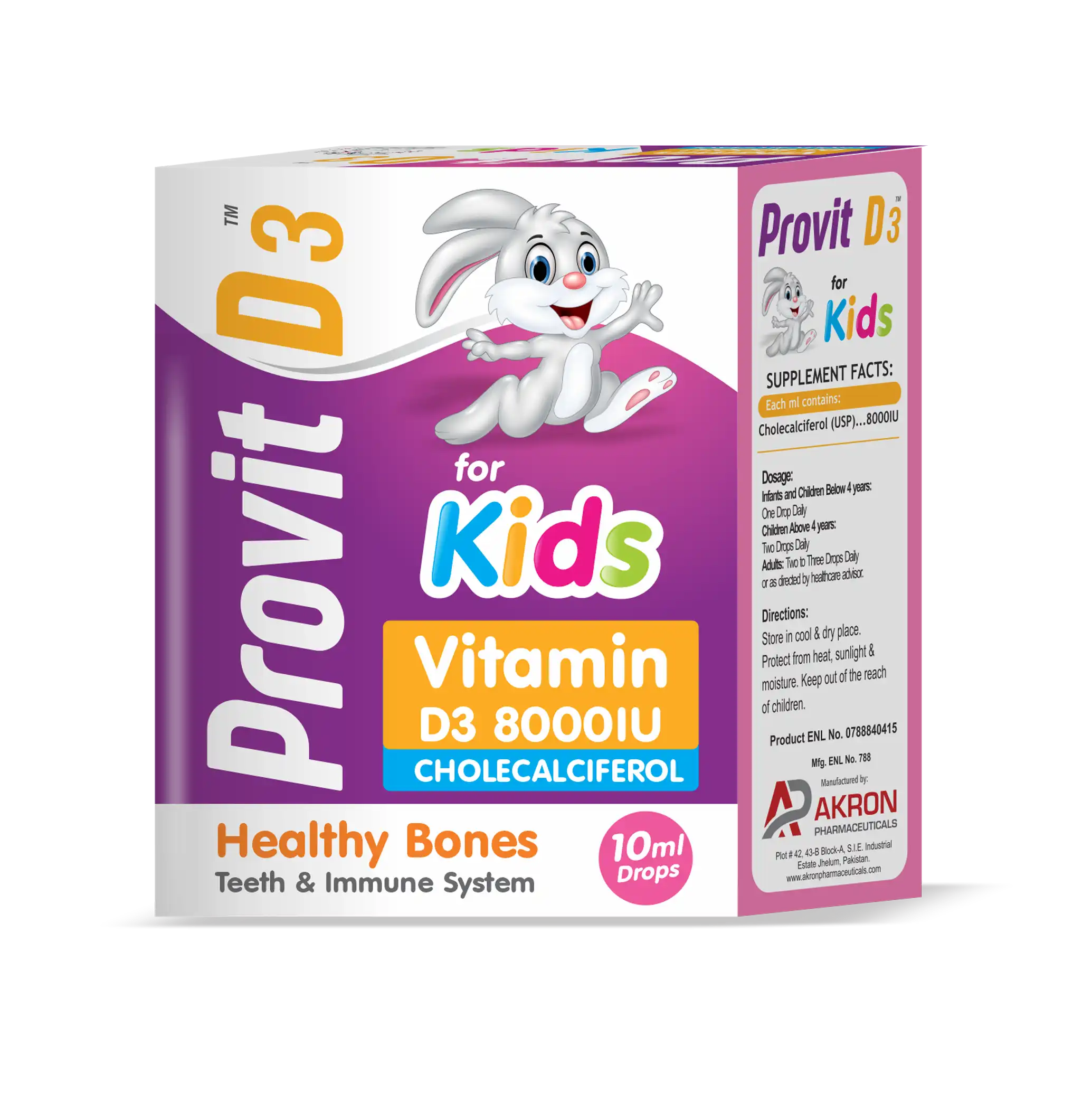 Provit D3 Drops for Kids are formulated to provide essential Vitamin D3, crucial for calcium absorption, bone growth, and overall immune support in children. Vitamin D3 helps maintain strong bones and teeth, supports a healthy immune system, and is particularly beneficial for children with limited sun exposure.