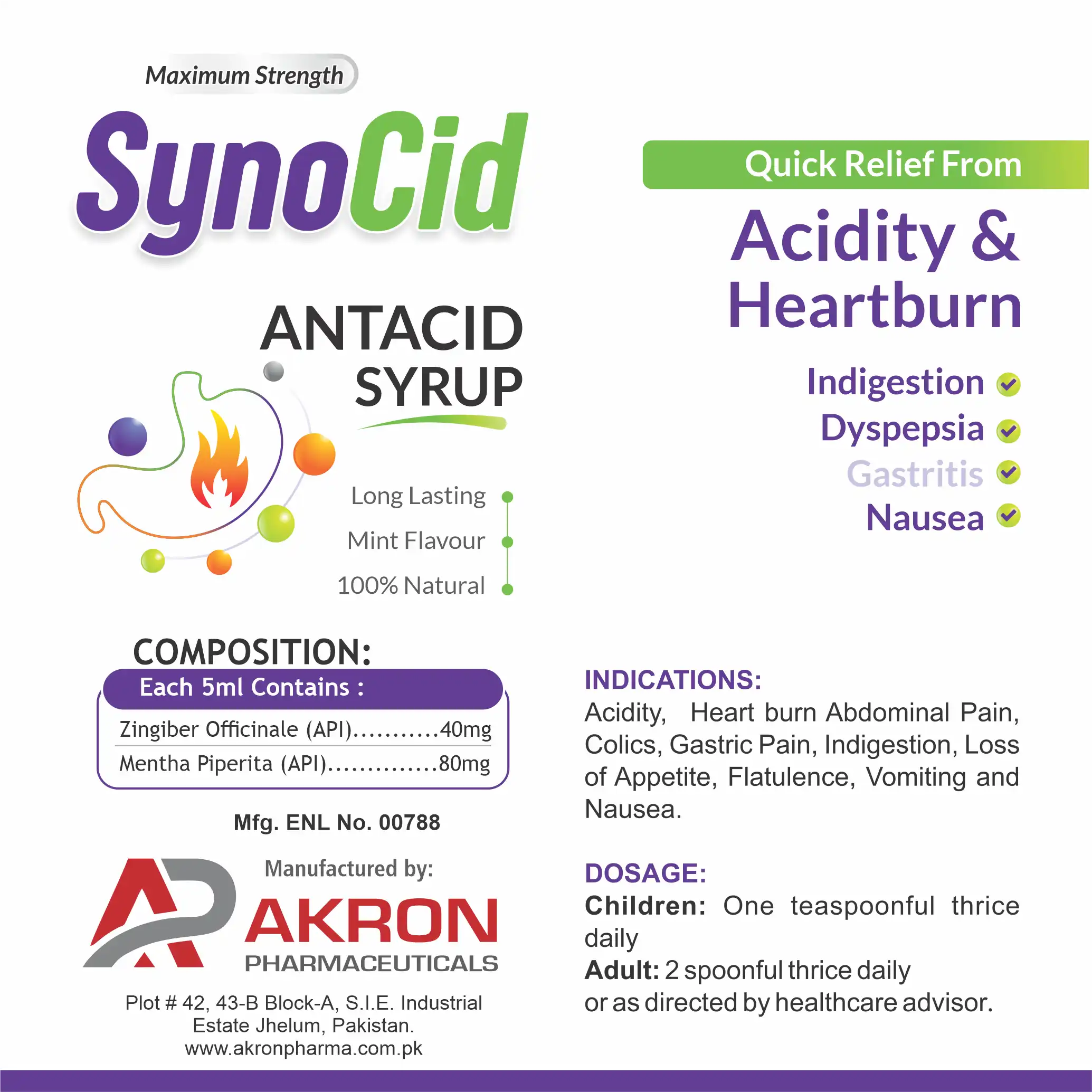 Synocid Syrup is a natural antacid and digestive support syrup formulated with Ginger and Peppermint extracts to help provide effective relief from acidity, heartburn, indigestion, and stomach discomfort.