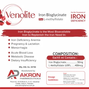 Venolite Syrup is a premium iron and folate supplement formulated to effectively replenish the body’s iron needs. Iron Bisglycinate is one of the most bioavailable forms of iron, ensuring maximum absorption and minimal gastrointestinal discomfort. L-Methylfolate (USP) supports proper red blood cell formation, energy production, and overall metabolic health.